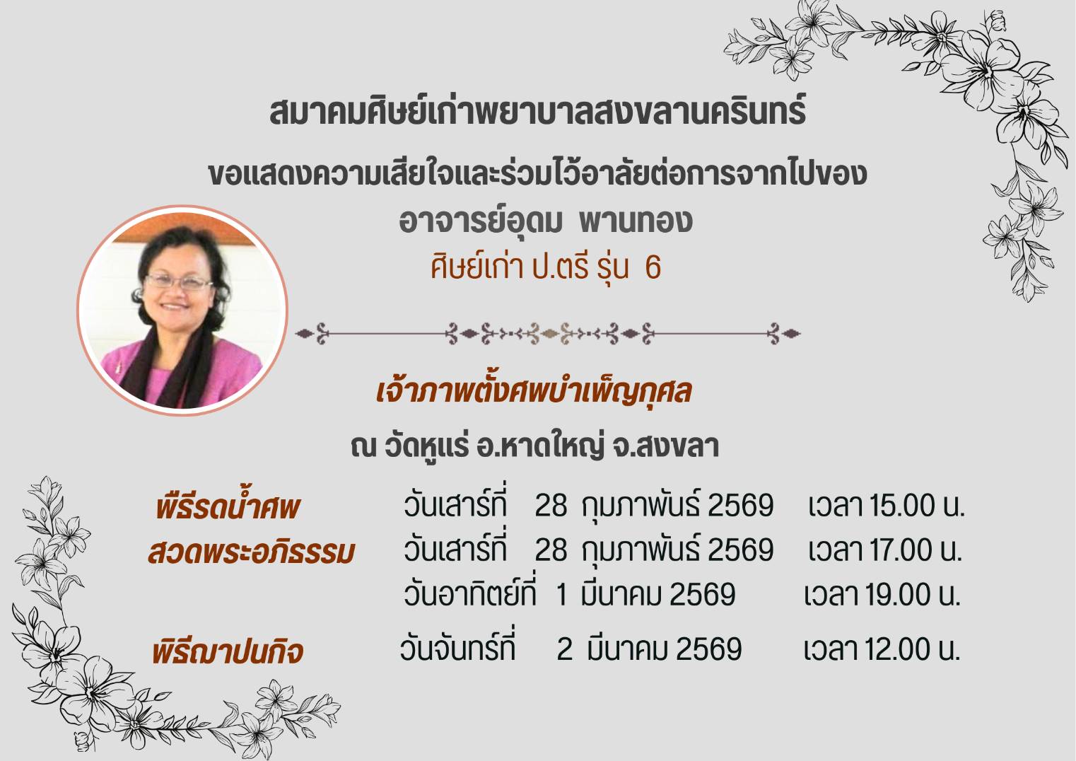 รายละเอียด : วันที่ 1 มีนาคม 2569 ตัวแทนสมาคมฯ นำโดย พว.ชุติกาญจน์ รัตนโอภา นายกสมาคม พว.อาภรณ์ พงษหา พว.นงลักษณ์ ว่องวิษณุพงศ์ และพว.ใหมมูนะ สังขาว ได้มอบเงินสวัสดิการสมาคมฯ ทำบุญการช่วยเหลือครอบครัวของอาจารย์อุดม พานทอง อดีตประธานชมรมศิษย์เก่าพยาบาลสงขลานครินทร์ และสมาชิกสมาคมฯ ที่เสียชีวิต
