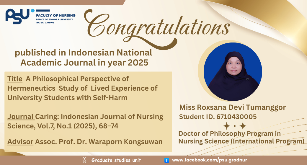 🎉 Congratulations to Ms. Roxsana Devi Tumanggor, Student ID 6710430005, a doctoral student in the Doctor of Philosophy Program in Nursing Science (International Program), for her publication in Indonesian National Academic Journal in the year 2025