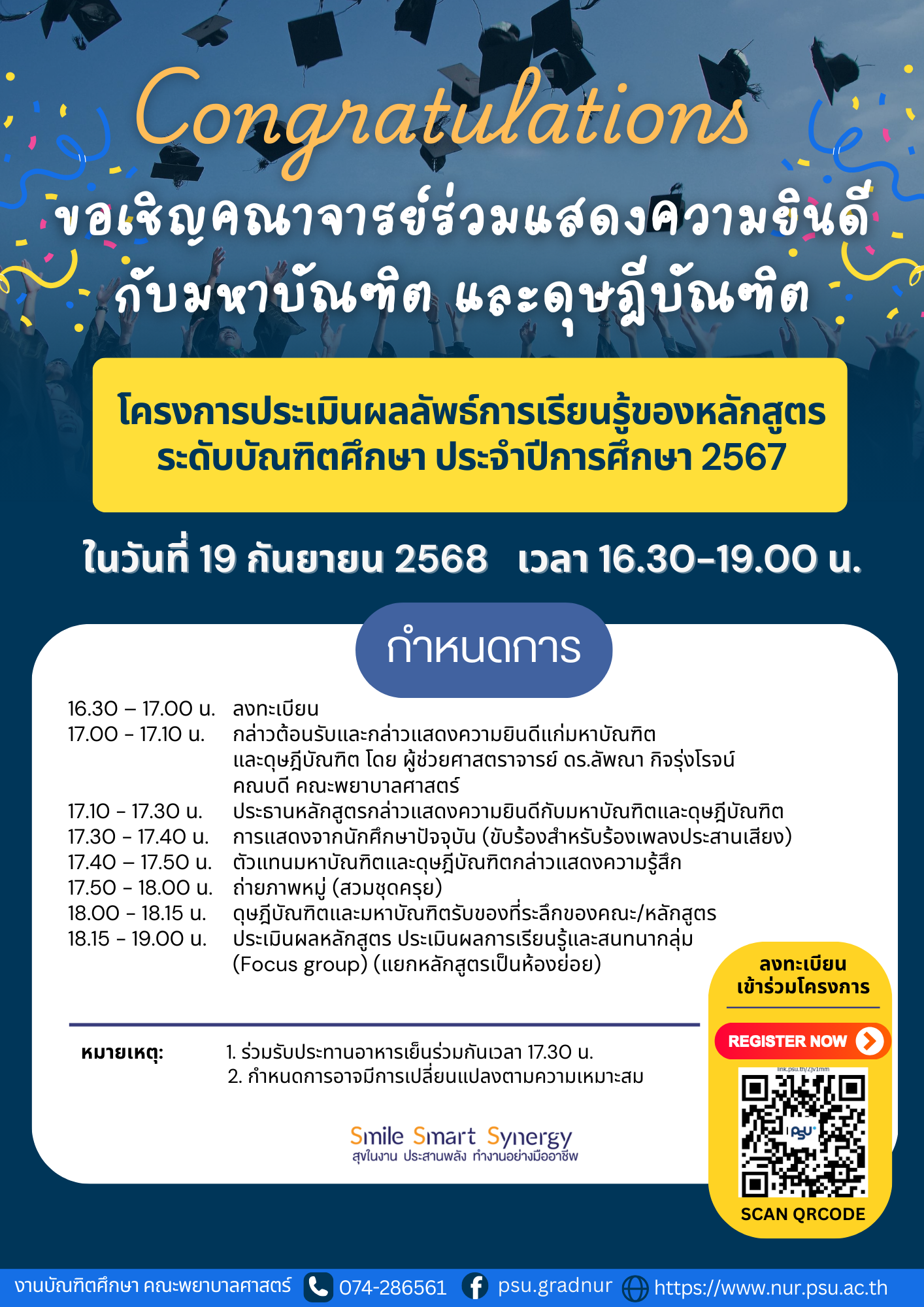 ขอเชิญคณาจารย์ร่วมแสดงความยินดี กับมหาบัณฑิต และดุษฎีบัณฑิตในโครงการประเมินผลลัพธ์การเรียนรู้ของหลักสูตร ระดับบัณฑิตศึกษา ประจำปีการศึกษา 2567 วันที่ 19 กันยายน 2568