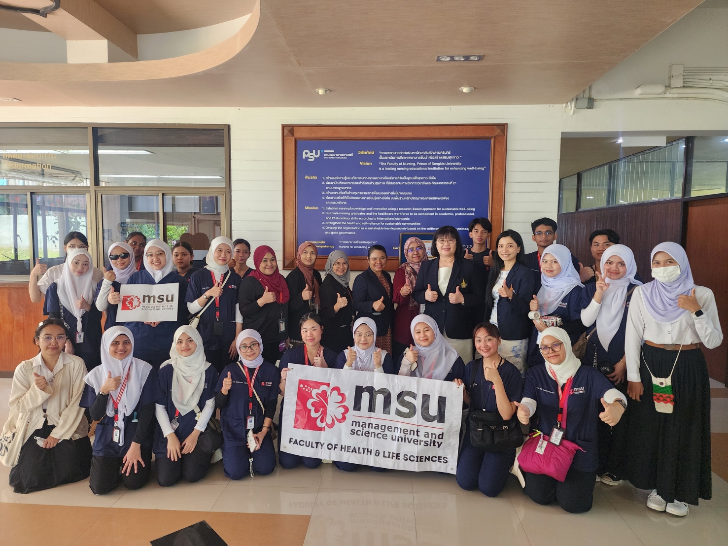 On April 25, 2025, from 10:00 AM to 12:00 PM, delegates from the Faculty of Health and Life Sciences, Management and Science University, Malaysia, visited the Faculty of Nursing, Prince of Songkla University to discuss potential research and academic collaborations, as well as to exchange excellence in managing the Bachelor of Nursing Science Program. The delegates also explored the Khunying Long Athakravisunthorn Learning Resources Center, the Nursing Learning Resources Center, and the Health Promotion and Elderly Rehabilitation Center.