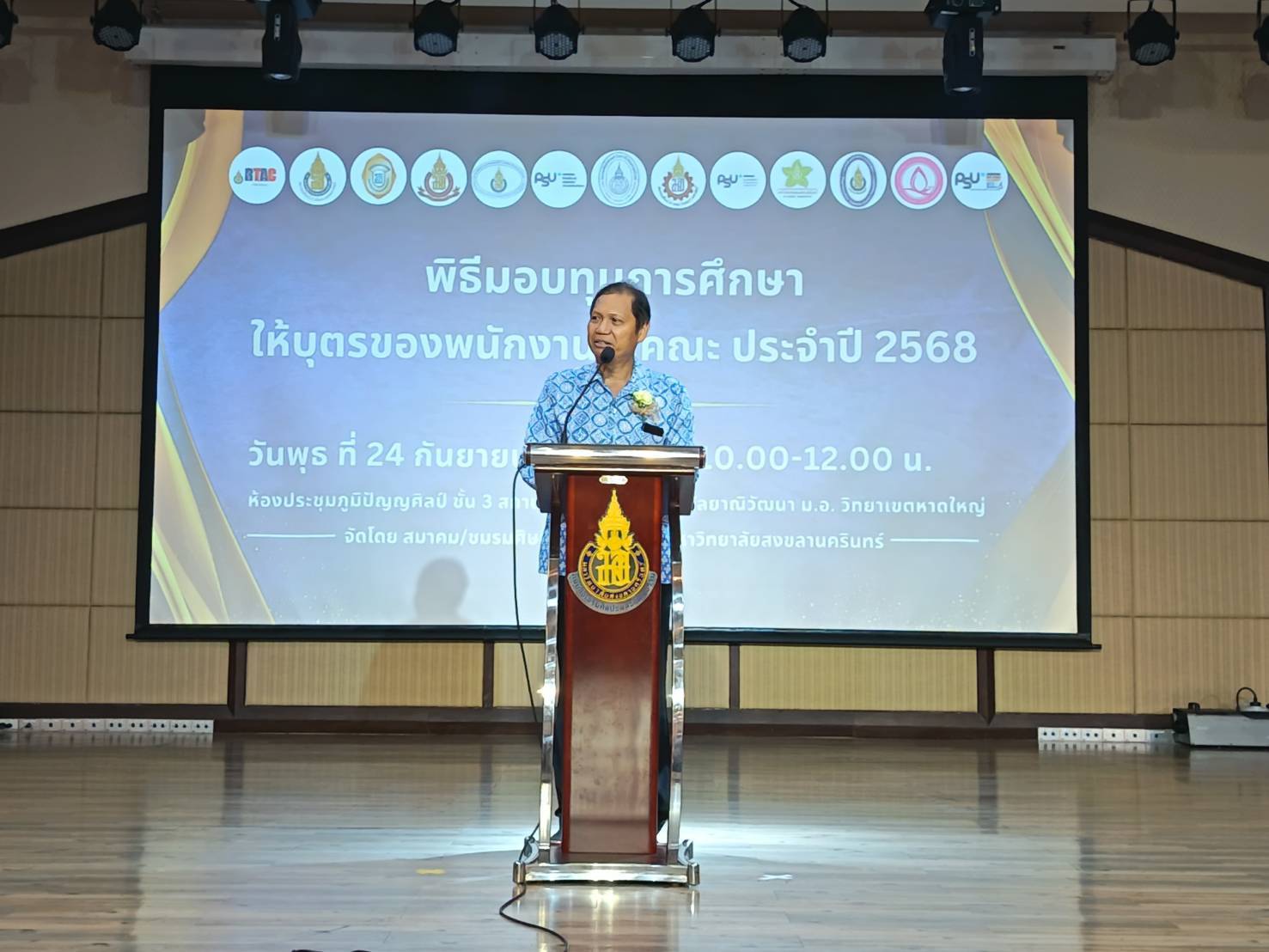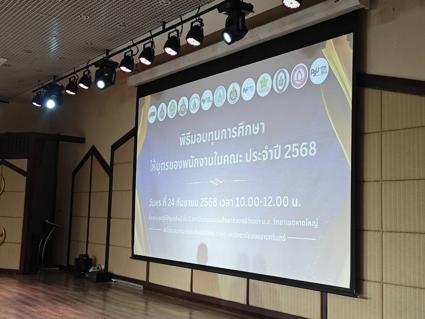 เมื่อวันที่ 24 กันยายน 2568 เวลา 10.00 น. คณะพยาบาลศาสตร์ โดย ผศ.ดร. ปรัชญานันท์ เที่ยงจรรยา รองคณบดีฝ่ายจัดการศึกษาปริญญาตรี เป็นตัวแทนคณบดีเข้าร่วมพิธี "มอบทุนการศึกษาให้บุตรของพนักงานในคณะ ประจำปี 2568" ซึ่งจัดโดยสมาคมศิษย์เก่า ม.อ. ร่วมกับสมาคม ชมรมศิษย์เก่าคณะรวม 12 องค์กร