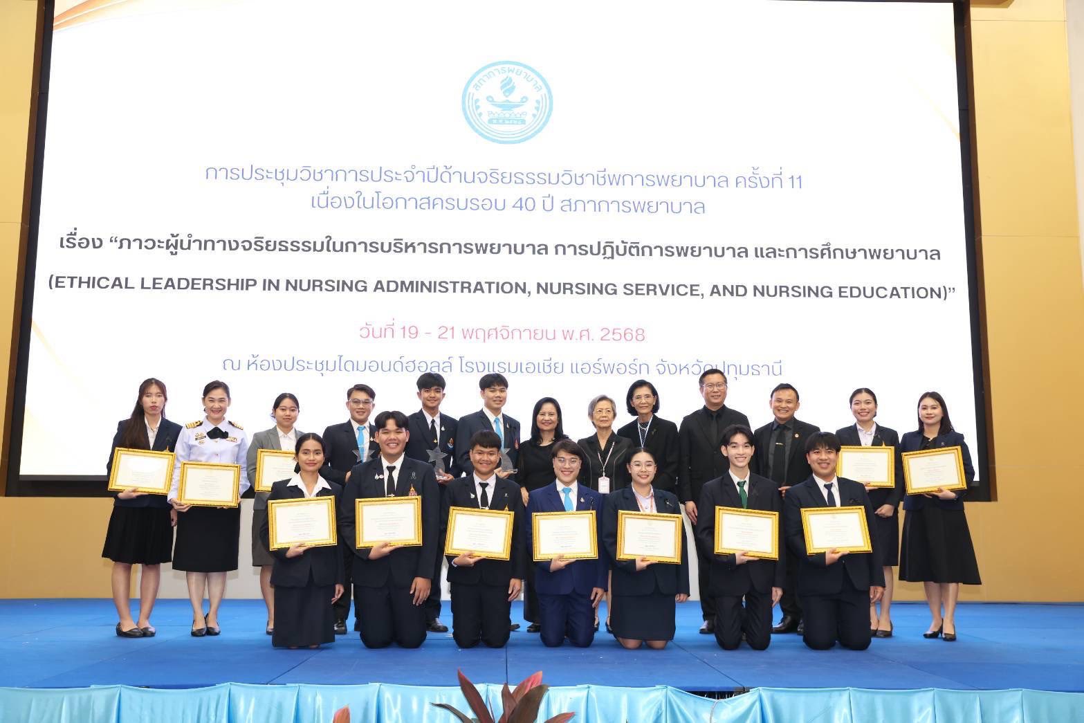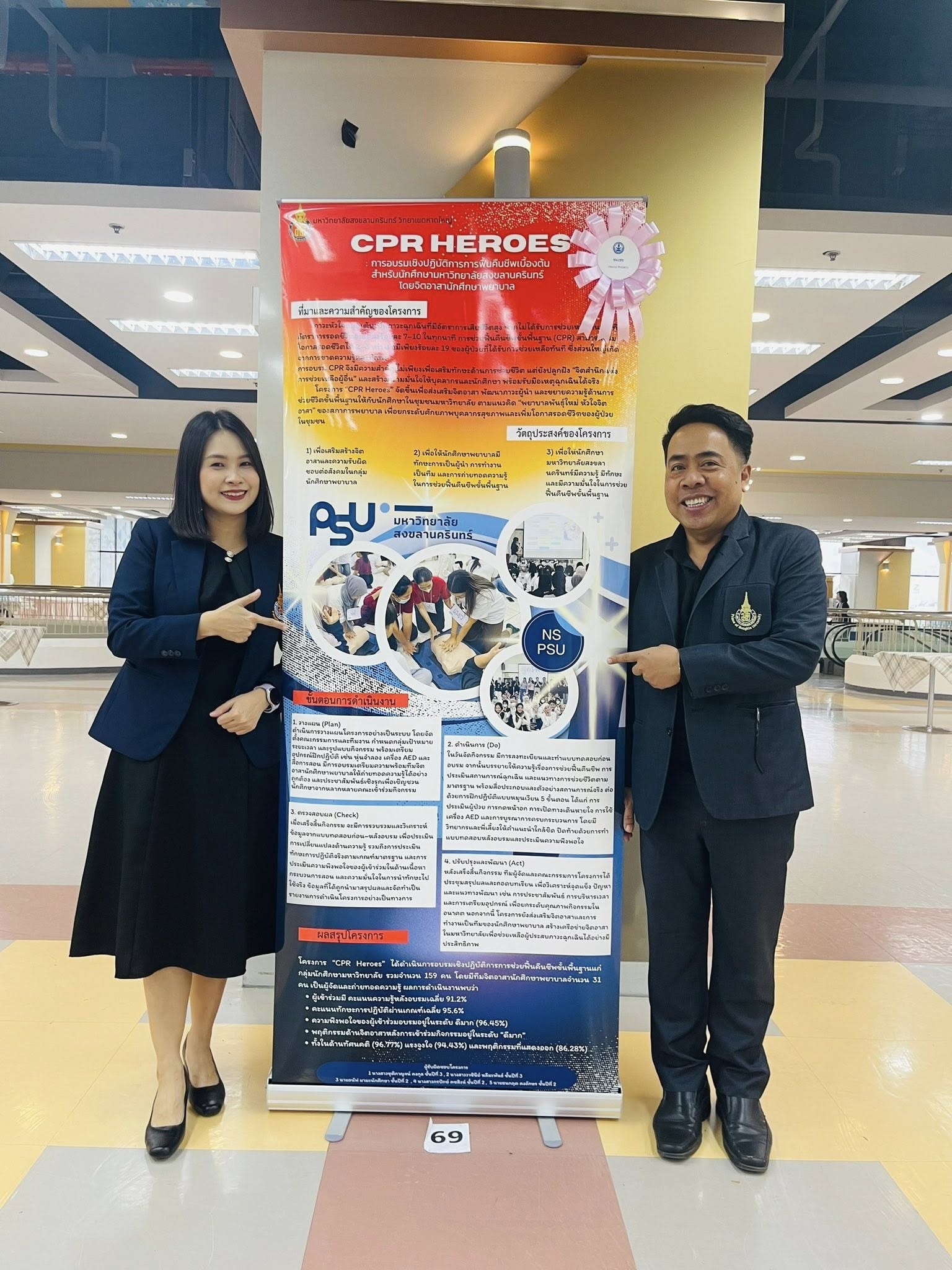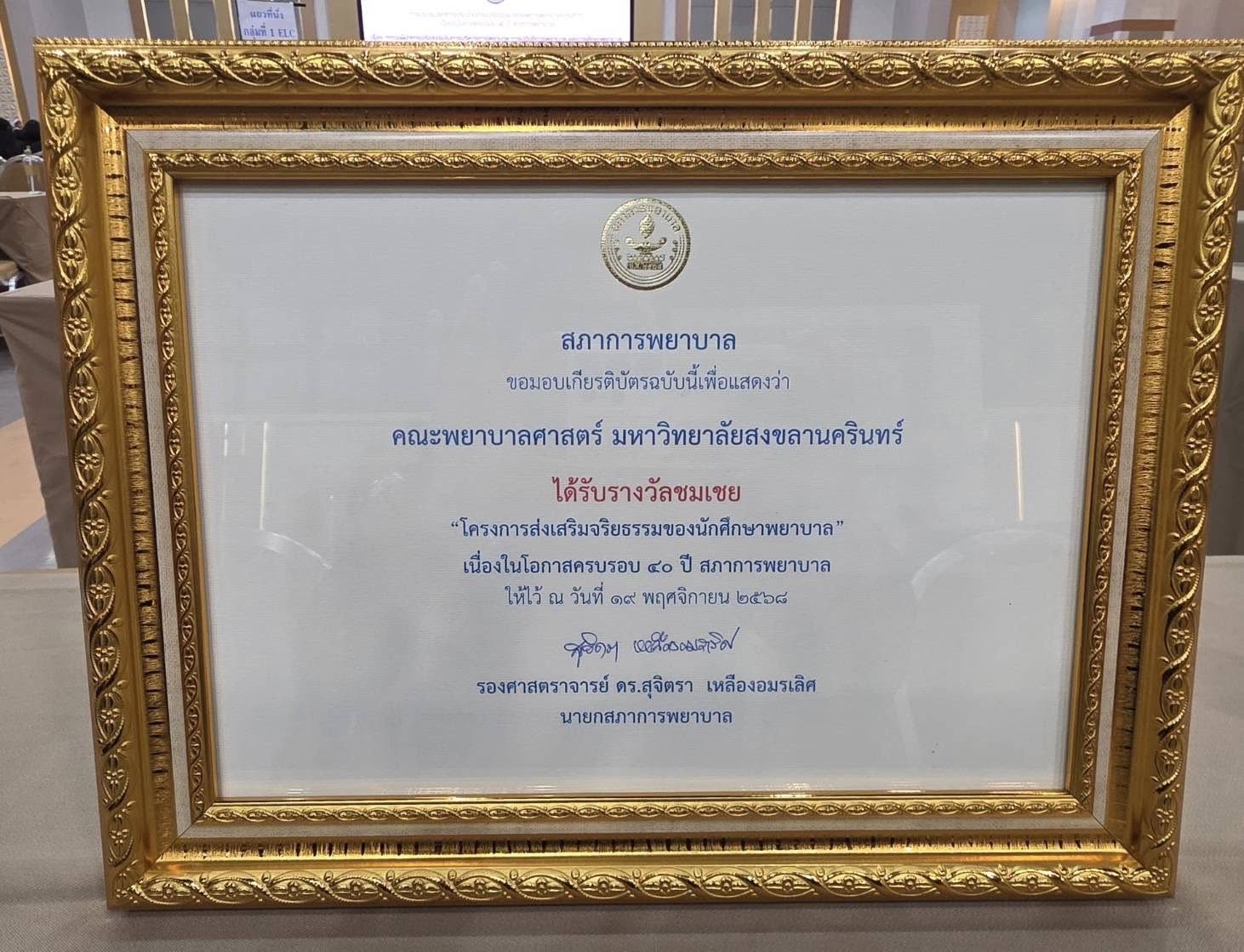 เมื่อวันที่ 19 พฤศจิกายน 2568 เวลา 16.00 - 18.00 น. คณะพยาบาลศาสตร์ โดย ดร.พิเชษฐ์ สุวรรณจินดา และอาจารย์เเสงทิพย์ ลีลากานต์ อาจารย์ที่ปรึกษา เข้ารับรางวัลเกียรติบัตร เนื่องในโอกาสผลงานเรื่อง "จิตอาสา CPR Heroes : การอบรมเชิงปฏิบัติการการฟื้นคืนชีพเบื้องต้นสำหรับนักศึกษามหาวิทยาลัยสงขลานครินทร์โดยจิตอาสานักศึกษาพยาบาล" ได้รับรางวัลชมเชย มีผู้รับผิดชอบโครงการคือนางสาวชุติกาญจน์ คงกุล เเละนางสาววาซินีย์ หลีมะพันธ์ นักศึกษาพยาบาลชั้นปีที่ 3 ในงานอบรมเชิงปฏิบัติการเรื่อง "Ethical Leadership Camp for Nursing Students" รุ่นที่ 5 โดยสภาการพยาบาล ณ ห้องประชุมไดมอนด์ฮอล ชั้น 5 โรงแรมเอเชีย แอร์พอร์ท จังหวัดปทุมธานี