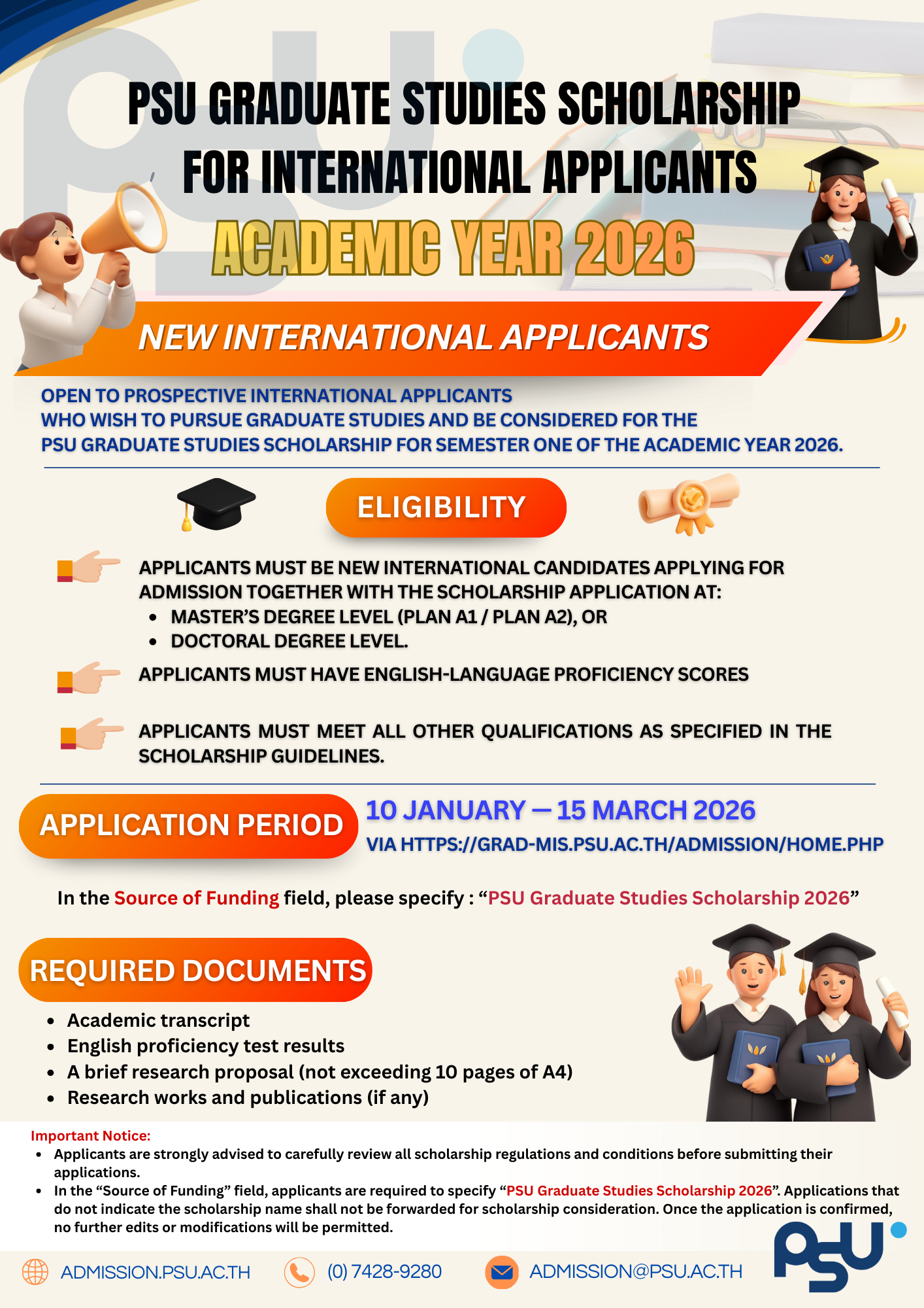 Please read the information at https://admission.psu.ac.th/en/psu-graduatestudiesscholarship2026/